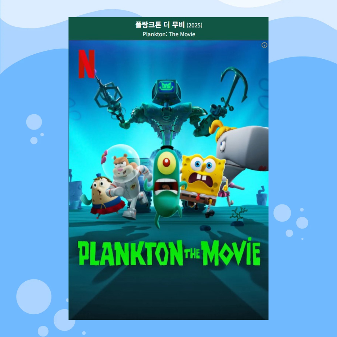 플랑크톤: 더 무비는 2025년 3월 7일, 넷플릭스에서 공개된 미국산 애니메이션 뮤지컬 코미디 영화입니다 . 이 작품은 인기 시리즈 『네모바지 스폰지밥(SpongeBob SquarePants)』의 대표적 악당 플랑크톤을 주인공으로 내세운 스핀오프 영화로, 넷플릭스에서 공개된 두 번째 스폰지밥 캐릭터 중심의 영화입니다. 첫 번째는 2024년 공개된 《Saving Bikini Bottom: The Sandy Cheeks Movie》입니다.
